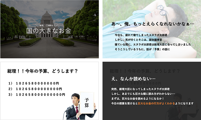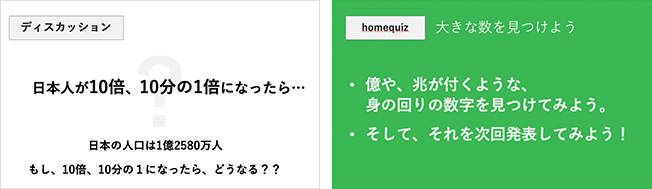 一般的な学校の授業の場合、「大きな数」という単元を教える場合、イチジュウヒャクセンマンオクチョウ・・・と数え方を教えることになりますが、いきなりそんな話をしだしても子どもたちはこの内容に対して興味のドアが開いていない状態です。